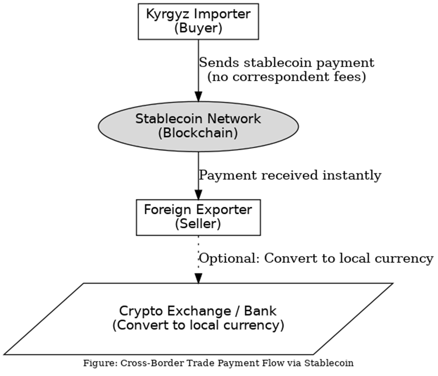 Stablecoin Payments: A Kyrgyz importer can pay a foreign supplier in stablecoin (digital som or even a som-denominated token convertible abroad) instantly, without correspondent bank fees. The supplier receives payment in minutes with transparency and can convert to their currency via exchanges if needed. This bypasses multiple currency conversions and days of wait.