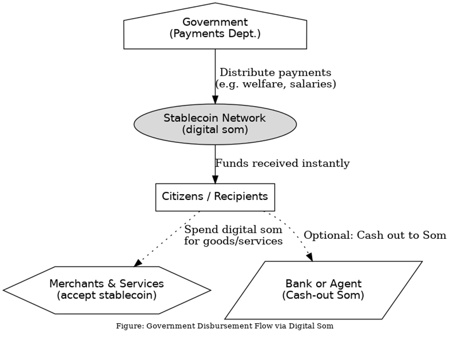Modernizing State Payments: The government (e.g. Ministry of Finance or social fund) can disburse salaries, pensions, and welfare benefits as digital som directly to citizens’ e-wallets. This reaches people even in remote areas instantly, without needing bank accounts.